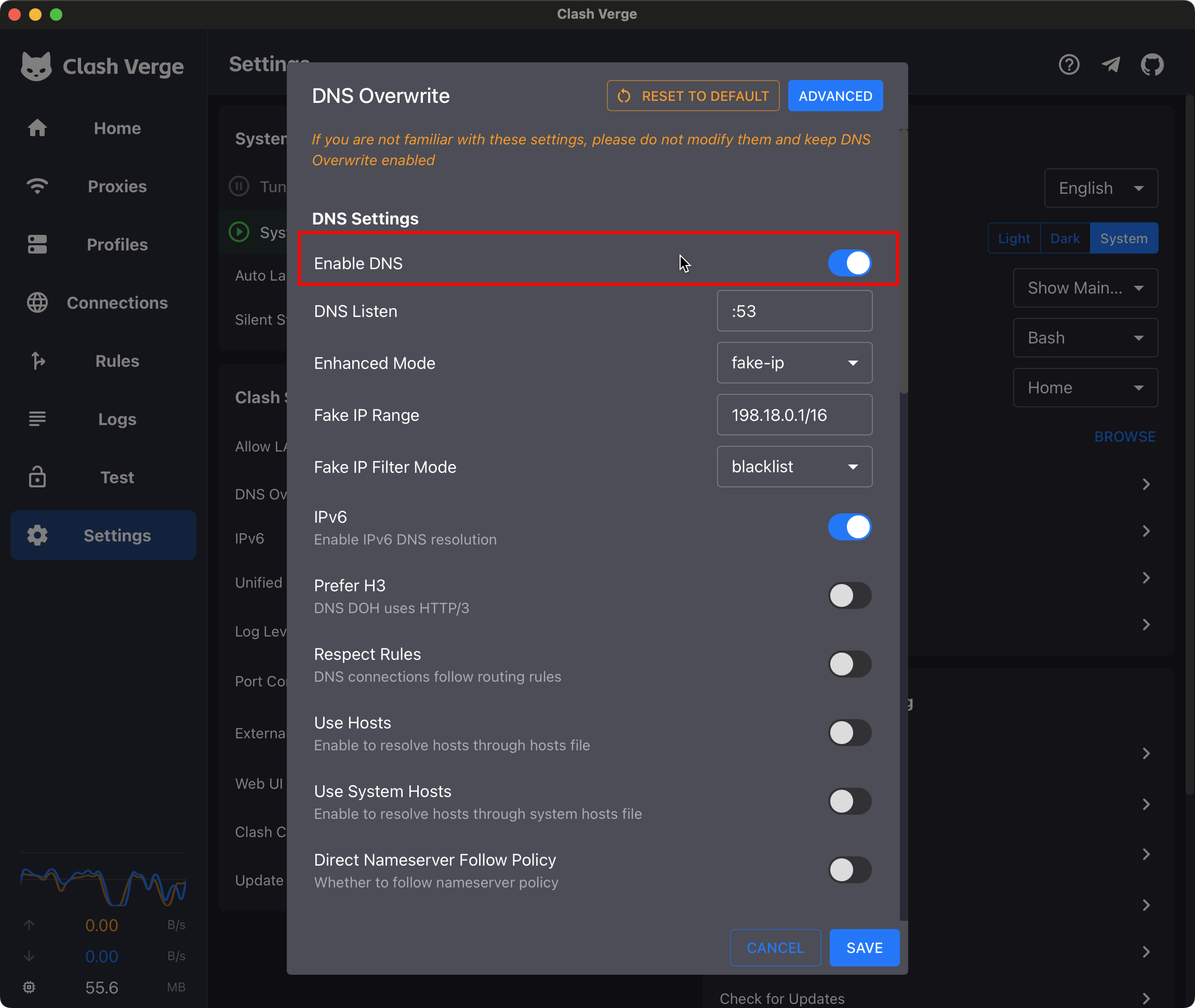 Turn off the Enable DNS switch and save the changes. You should be able to connect to the intranet now. But this solution is not recommended because it will disable the DNS fake-ip feature. You may lose the VPN protection.